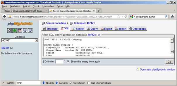 Sie das SQL Tab auswählen und das SQL Skript contacts_database.SQL vom Download-Archiv hineinkopieren. Aber